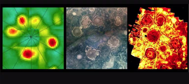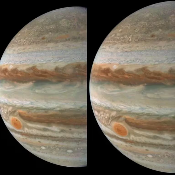 La nave espacial Juno capturó estas imágenes desde una distancia de unos 265.000 kilómetros sobre las cimas de las nubes jovianas, a una latitud de aproximadamente 5 grados al norte del ecuador. El científico ciudadano Gerald Eichstädt procesó los datos crudos del instrumento JunoCam para mejorar la calidad de las imágenes, según informó la NASA.