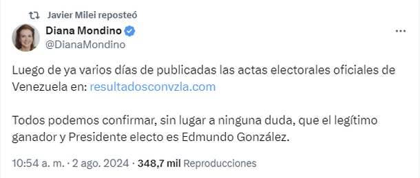 “Luego de ya varios días de publicadas las actas electorales oficiales de Venezuela en http://resultadosconvzla.com, todos podemos confirmar, sin lugar a ninguna duda, que el legítimo ganador y Presidente electo es Edmundo González”, aseguró la canciller Diana Mondino en un mensaje publicado en su cuenta personal de X (ex Twitter). El posteo incluso fue replicado por el propio presidente Javier Milei.
