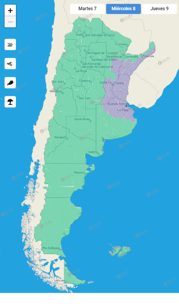 El Servicio Meteorológico Nacional (SMN) mantiene para este miércoles 8 de junio las advertencias por niebla para la Ciudad de Buenos Aires, la provincia de Buenos Aires, Corrientes, Entre Ríos, Misiones y Santa Fe.