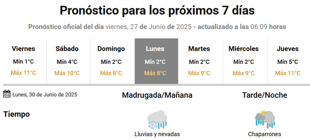 Según fuentes oficiales, el SMN anticipa para estos días temperaturas mínimas por debajo de los 0°C y la probabilidad de precipitaciones con aire frío suficiente en capas bajas, lo que podría generar episodios de agua nieve o incluso nevadas débiles, especialmente durante la madrugada y la noche.