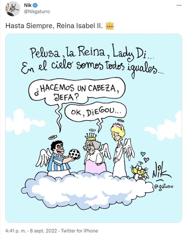 El dibujante Nik fue foco de la polémica cuando ayer publicó una caricatura en alusión a la muerte de la reina Isabel II que incluía a Diego Maradona y a Lady Di en lo que parece ser el Cielo.