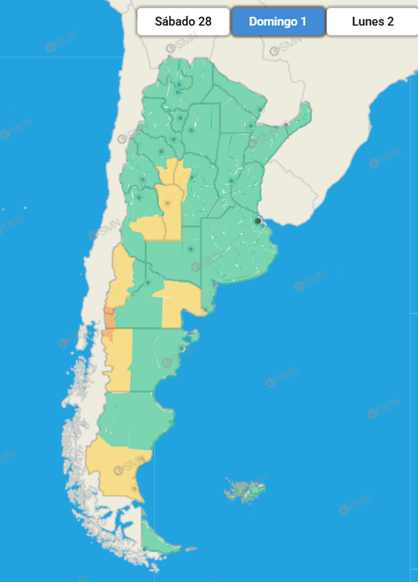 Los territorios del país que estarán afectados por la alerta amarilla de este domingo son San Luis y Mendoza, donde se registrarán tormentas, así como también en Río Negro.