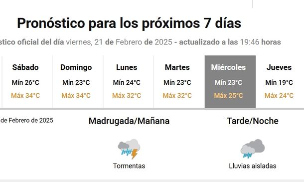 Para este sábado y domingo, 22 y 23 de febrero, el SMN anuncia temperaturas máximas de 34 grados y mínimas de 26 grados.