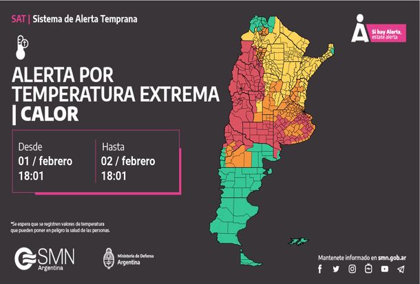El Servicio Meteorológico Nacional (SMN) renovó y extendió alertas por calor extremo en casi todo el país, vigente desde las 18 de este jueves y hasta la misma hora del viernes, con excepción de solo tres provincias: Chubut, Santa Cruz y Tierra del Fuego.