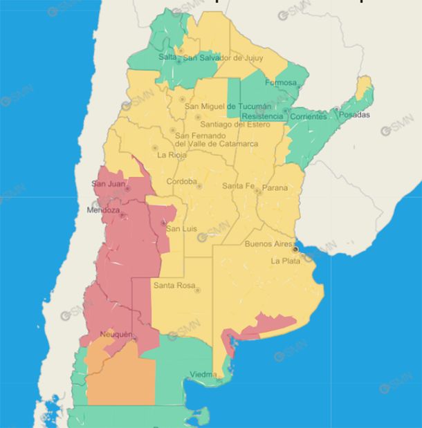 En tanto, varios distritos de San Juan, Río Negro y Neuquén, así como de la provincia de Buenos Aires (norte de Tres Arroyos, de Necochea, de Coronel Dorrego, entre otras) están bajo nivel naranja por temperaturas extremas, que pueden resultar peligrosas para los grupos de riesgo.