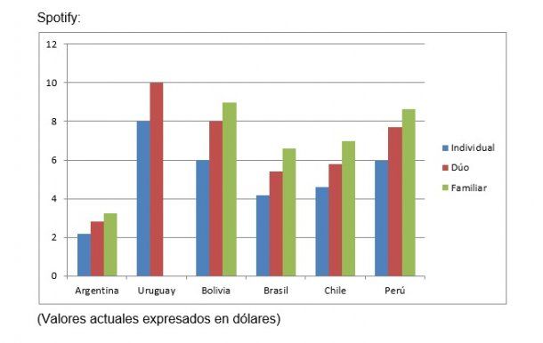 Con solo comparar los datos de los costos en dólares de los distintos planes mensuales de suscripción (Plan Individual; Plan Dúo y Plan Familiar) que figuran en los sitios oficiales de Spotify en Argentina y la región, puede verse que nuestro país con los aumentos incluidos, representan las tarifas más bajas.