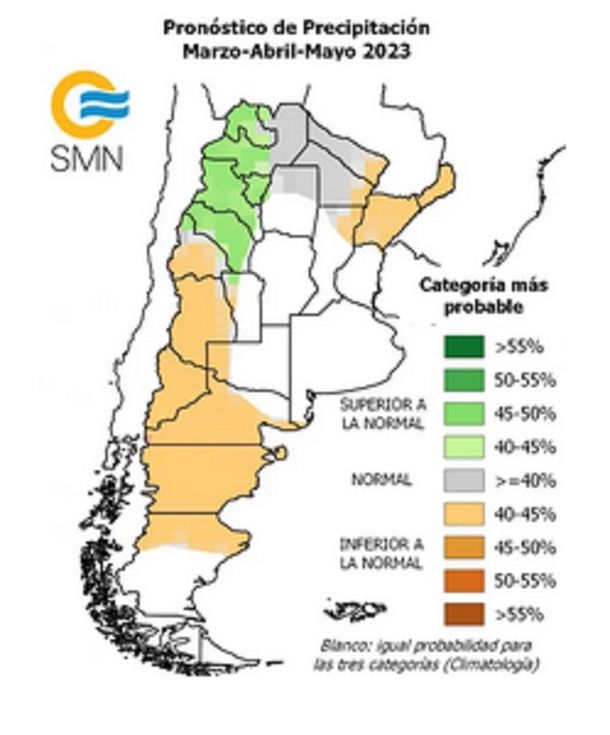 Para el periodo marzo-abril-mayo 2023 es más probable que se registren lluvias normales o inferiores a lo normales en el norte del Litoral, Cuyo y el centro y norte de Patagonia, mientras que, en el extremo norte argentino se espera que se mantengan dentro del rango normal.