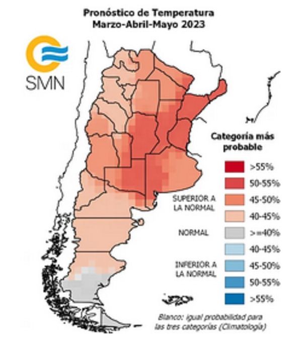 Durante este trimestre hay una mayor probabilidad de registrar temperaturas superiores a lo normal en gran parte del centro y norte de Argentina. En el NOA (Noroeste Argentino) y el centro y norte de Patagonia, éstas pueden ser normales o superiores a lo normales. Debido a esta situación pueden desarrollarse, especialmente en la primera parte del otoño, eventos tardíos de ola de calor.