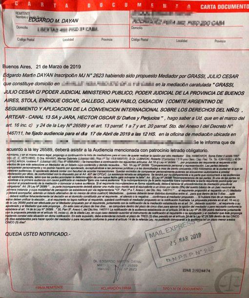 "El condenado por abuso sexual y protegido de Francisco, Julio César Grassi, me hace y nos hace juicio por ´daños y perjuicios´ desde la cárcel. En mi caso por ejercer mi profesión como Médico Psiquiatra de “Gabriel” victima por la que está preso el condenado cura. Es una intimidación y amenaza desde su celda", dijo el psiquiatra Stola.