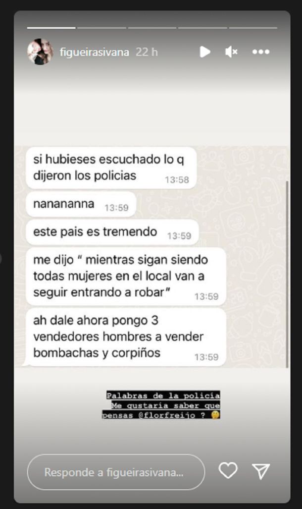 En este contexto, la modelo se mostró indignada por la respuesta de la policía. Según le contó la vendedora víctima del robo, el efectivo les dijo: “Mientras sigan siendo todas mujeres en el local van a seguir entrando a robar". “No entiendo qué quiso decir, ¿si son hombres vendiendo bombachas y corpiños acaso no te roban?”, cuestionó.