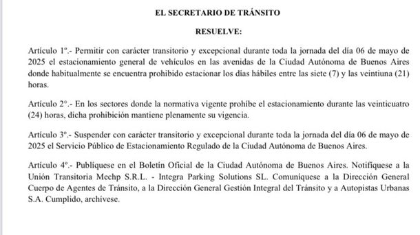 “Suspender con carácter transitorio y excepcional durante toda la jornada del día 6 de mayo de 2025 el Servicio Público de Estacionamiento Regulado en la Ciudad Autónoma de Buenos Aires”, indica la resolución.