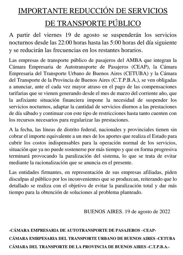 Las empresas de transporte público de pasajeros en el el Área Metropolitana de Buenos Aires (AMBA) anunciaron un paro de colectivos desde las 22 del viernes 19 de agosto y hasta las 5 del sábado 20. Además, se reducirán las frecuencias en el resto de los horarios.