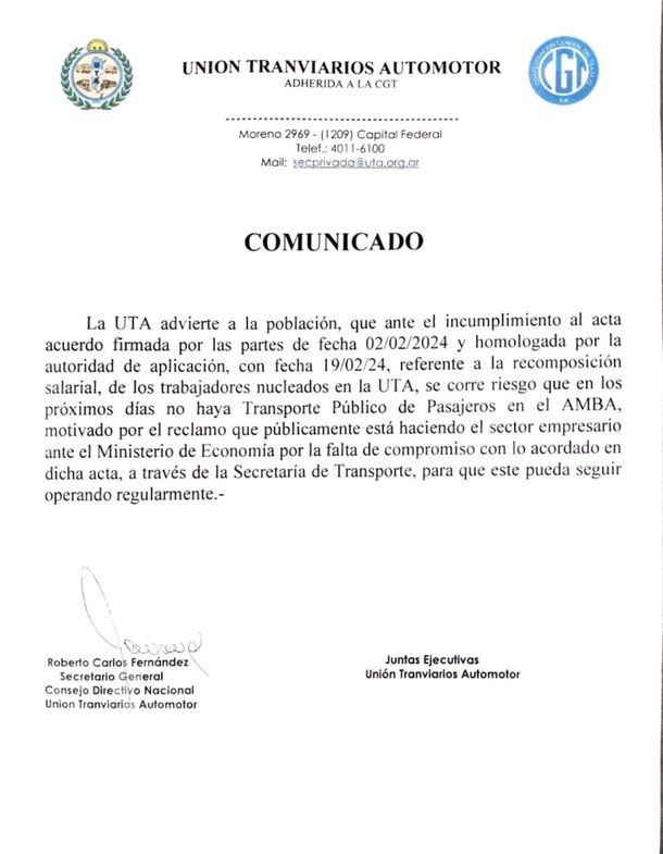 "La UTA advierte a la población, que ante el incumplimiento al acta acuerdo firmada por las partes de fecha 02/02/2024 y homologada por la autoridad de aplicación, con fecha 19/02/24, referente a la recomposición salarial, de los trabajadores nucleados en nuestro sindicato", resaltan en el texto.
