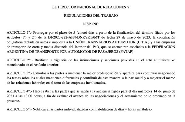 Además, minutos antes de la medianoche se dictó una nueva conciliación obligatoria por cinco días más para UTA (colectivos de AMBA) y FATAP (colectivos en el interior del país), con promesa de nueva audiencia para el miércoles. Sin embargo, cerca de la madrugada no había servicio en varias zonas del interior.