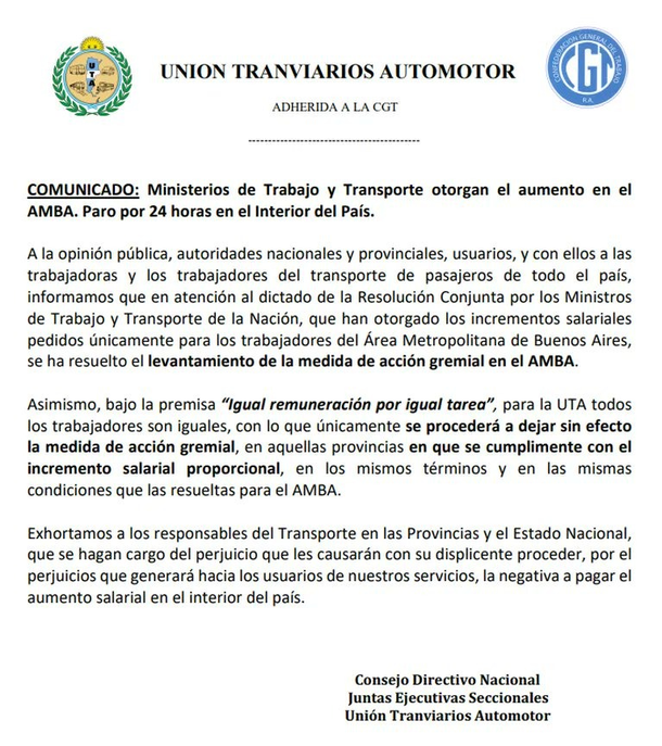 Así lo informó la UTA en un comunicado donde determinó que a "igual remuneración por igual tarea", por lo tanto, "únicamente se procederá a dejar sin efecto la medida de acción gremial en aquellas provincias en que se cumplimente con el incremento salarial proporcional en los mismos términos y condiciones que las resueltas para el AMBA".