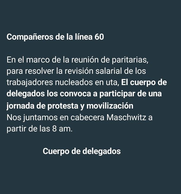 "Debemos buscar la unidad de todos los trabajadores del transporte para exigir al gremio un plan de lucha y así conseguir el aumento de nuestro salario equipararlos con los compañeros de técnica y abordar la discusión para que estos se jubilen a los 55 años como los choferes porque en las paritarias no solo se discute salario sino también salud y condiciones", finaliza.