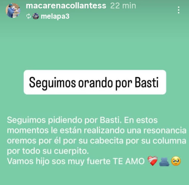 “Seguimos pidiendo por Basti. En estos momentos le están realizando una resonancia, oremos por él, por su cabecita, por su columna, por todo su cuerpito. Vamos hijo, sos muy fuerte. TE AMO”, escribió Macarena, su madre horas antes de que se sepan los resultados de los estudios.