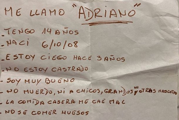 “Me llamo Adriano. Tengo 14 años. Nací el 6 de octubre de 2008. Estoy ciego hace tres años. No estoy castrado. Soy muy bueno. No muerdo ni a chicos, a grandes ni a otras mascotas. La comida casera me cae mal. No se comer huesos”, decía el mensaje.