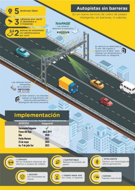 Este nuevo sistema de peaje sin barrera se realizará a través de portales con lectura electrónica, por lo que los autos no deberán detenerse ya que se identificarán las patentes, se detectará el tipo de vehículo y se emitirá el cobro automático a través del Telepase o emitiendo una factura que llegará al domicilio del usuario.