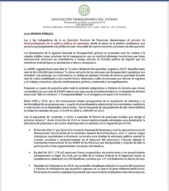 También indicaron que se “organizó hace unos días la ‘Cumbre Global de Discapacidad, Argentina 2019’ despilfarrando más de $65.000.000” cuando se cajonean “trámites de extrema gravedad durante más de 3 años condenando a una muerte lenta y silenciosa a miles de personas que carecen de ingresos y de trabajo y necesitan, además, medicamentos, prótesis, contención y acompañamiento”.