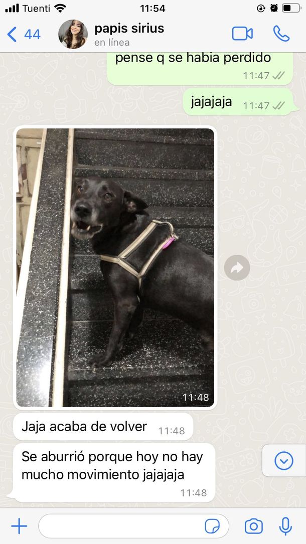 Como respuesta, le enviaron: “Está de paseo jaja”. Minutos más tarde le enviaron otra foto del perro en su casa: “Acaba de volver, se aburrió porque hoy no hay mucho movimiento”, dijo en referencia al feriado del 25 de mayo.