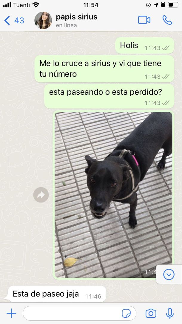 “Holis, me crucé a Sirius y vi que tiene tu número. ¿Está paseando o está perdido?”, le escribió la mujer a los dueños.