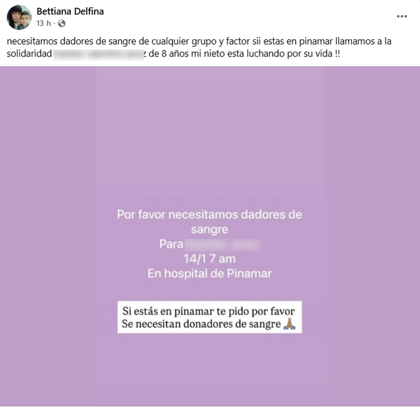 “Necesitamos dadores de sangre de cualquier grupo y factor. Si estás en Pinamar, llamamos a la solidaridad. Batian, de 8 años, mi nieto, está luchando por su vida!!”, publicó el martes por la tarde Bettiana, la abuela del nene, en redes sociales.