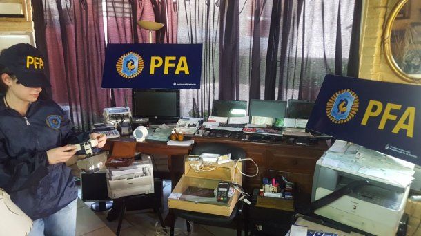 En los departamentos se incautaron 947 cheques adulterados; 18 chequeras; dos frascos goteros con sustancia blanquecina; 11 impresoras; un scanner, seis notebooks y CPUS; tres máquinas detectoras de dinero falso, un bisturí; lupas; dos lámparas ultra violeta para billetes; siete tarjetas de plástico en blanco tamaño tarjeta de crédito, una máquina de contar billetes; calculadoras, 24 celulares; 268 cuños para la fabricación de sellos, papel de calcar con firmas escritas y dinero en efectivo.
