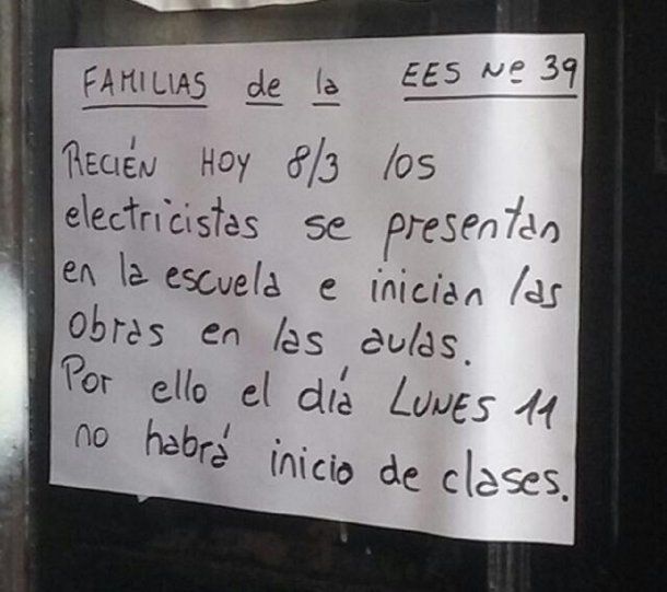 Luego detalla que “eran dos días por grado y con horario reducido porque no hay baños, no iban a tener recreos por lo que salían una hora antes”. Ante estas condiciones, los padres y la directora se negaron a que comenzaran las clases.