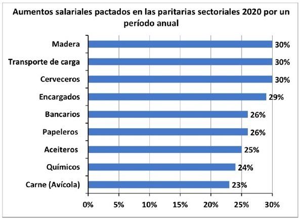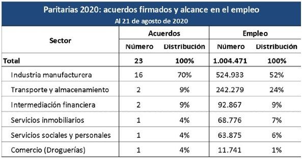 Hasta agosto de 2020, se firmaron 23 acuerdos salariales sectoriales que establecieron aumentos para un millón de asalariados privados en relación de dependencia, número que representa un 19% del total del empleo del sector privado. Si bien, los acuerdos firmados reconocen características disímiles, se podría afirmar que la mayoría de los convenios de amplia cobertura en cantidad de trabajadores, presentaron contenidos convergentes en materia de incremento pactado, período de vigencia e inclusión de cláusulas de revisión.