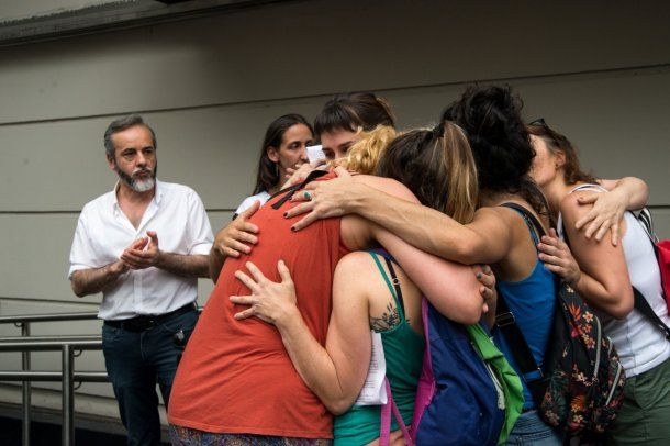 Los docentes convocaron este miércoles a un abrazo solidario para pedir por la reincorporación inmediata de los diez despedidos del que participaron más de mil personas entre alumnos, ex alumnos, docentes, ex docentes, familias y vecinos. También contaron con el apoyo de todos los sindicatos docentes de la ciudad, legisladores y otras personalidades del mundo educativo y de la colectividad judía.