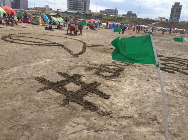 El domingo, el verde se propagó en las playas y más tarde en los tribunales penales de Mar del Plata. Las bikinis, indumentaria y banderines verdes coparon las playas céntricas y hasta se hizo un pañuelo gigante en la arena, al borde del mar atlántico, con el hashtag aborto legal 2020.