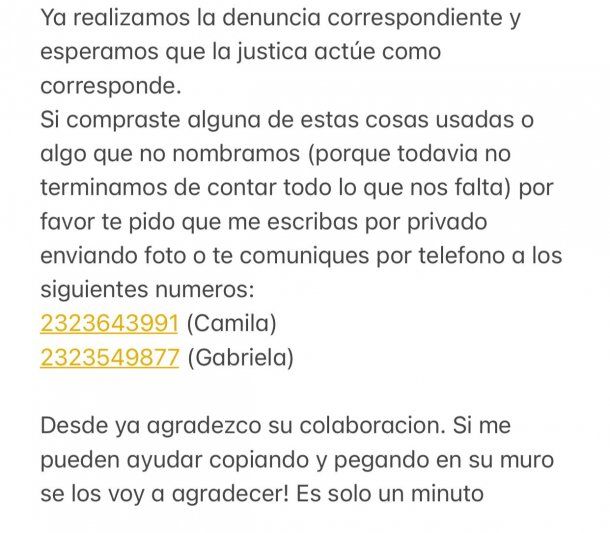 A través de las redes sociales, la familia solicitó: “Si compraste alguna de estas cosas usadas o algo que no nombramos (porque todavía no terminamos de contar todo lo que nos falta) por favor te pido que me escribes por privado enviándome una foto o te comuniques por teléfono”.