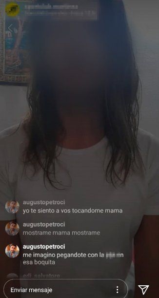 En plena clase, una cuenta a nombre de augustopetroci, que mostraba su foto, comenzó a hacer comentarios de contenido sexual agraviante. Primero fue un “hola”…”que linda boca tenés”. Pero al instante lanzó “yo te siento a vos tocándome mama”. ”mostrame mama mostrame”..”me imagino pegándote con la pija en esa boquita”.
