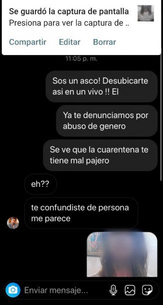 En los vivos de Instagram, todos los que están siguiendo la clase pueden ver el contenido y el nombre de la persona que lo expresa. En ese sentido, Carolina relató que, atónitos por el contenido violento sexual con el que ese usuario se manifestaba en forma pública, una de las asistentes a la clase virtual le dice al agresor: “Sos un asco! Desubicarte así en un vivo” “Ya te denunciamos por abuso de género” “Se ve que la cuarentena te tiene mal pajero”.