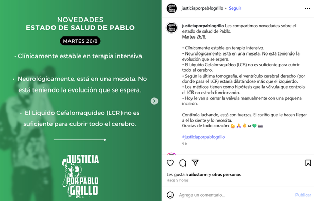 En las primeras horas de este martes, la familia de Pablo Grillo sorprendió con un nuevo parte médico en la cuenta de Instagram que manejan, aunque no con las mejores noticias. Allí especificaron que el joven que fue brutalmente atacado por la Gendarmería el pasado 12 de marzo durante una marcha de jubilados "no está teniendo la evolución que se espera".