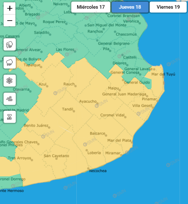 Las zonas afectadas serán, entre otras, San Clemente del Tuyú, Mar del Tuyú, Villa Gesell, Pinamar, Mar del Plata, Miramar, Necochea, Tandil, Coronel Vidal, Balcarce, General Juan Madariaga y Azul.