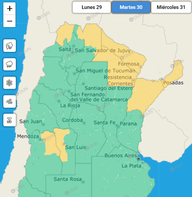 Los territorios del país que estarán afectados por la alerta amarilla son Salta, Jujuy, Formosa, Chaco, Corrientes, Misiones, San Luis y Mendoza.