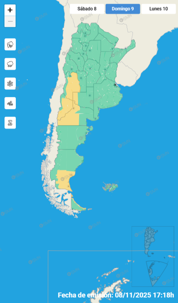 El Servicio Meteorológico Nacional (SMN) emitió seis alertas meteorológicas para sendas provincias argentinas, en todos los casos de nivel amarillo, lo que implica “posibles fenómenos con capacidad de daño y riesgo de interrupción momentánea de actividades cotidianas”, según las describe el organismo oficial.