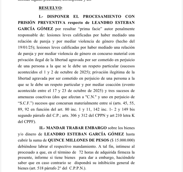 El juez del Juzgado Nacional en lo Criminal y Correccional N°13, Diego Slupsky, procesó este martes con prisión preventiva a Leandro García Gómez, expareja de Lourdes Fernández, detenido y acusado de ejercer los delitos lesiones, violencia de género y privación ilegal de la libertad sobre la integrante de Bandana. Además le impuso un embargo por $15 millones.