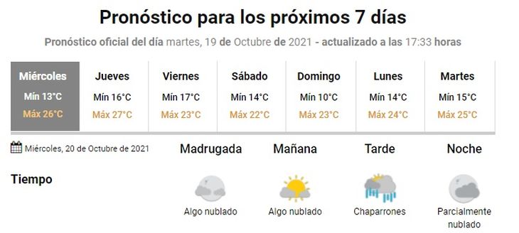 Para el jueves, el organismo anticipa cielo algo nublado durante todo el día, con temperaturas entre 16 y 27 grados, mientras que el viernes tendría cielo nublado por la mañana y posibles tormentas aisladas por la tarde, con una mínima de 17 y una máxima de 23.