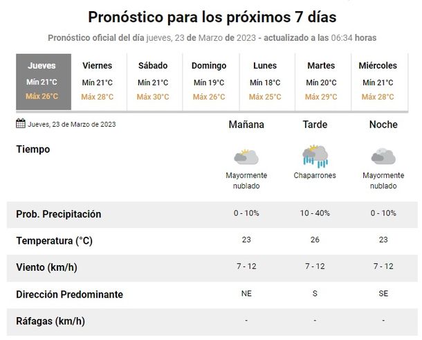 Para mañana viernes, feriado, el organismo prevé una jornada con cielo parcialmente nublado a mayormente nublado, vientos del sector este y una temperatura que se ubicará entre los 21 grados de mínima y 28 de máxima.