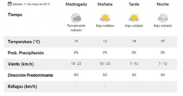 El sábado estará nublado pero sin lluvias. La mínima estará en los 11 y los 19 grados.