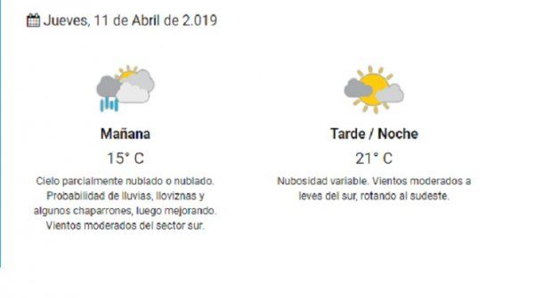El Servicio Meteorológico Nacional pronostica un jueves con cielo nublado, lloviznas y hasta posibles chaparrones, aunque por la tarde mejorarán las condiciones. La temperatura estaría entre los 15 y los 21 grados.