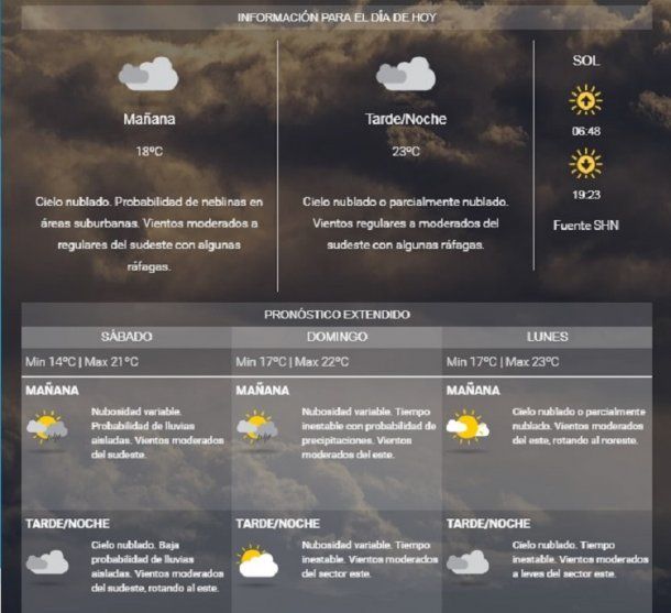El Servicio Meteorológico Nacional pronostica un viernes con cielo nublado durante todo el día; la mínima estaría en los 18° y la máxima en los 23°.