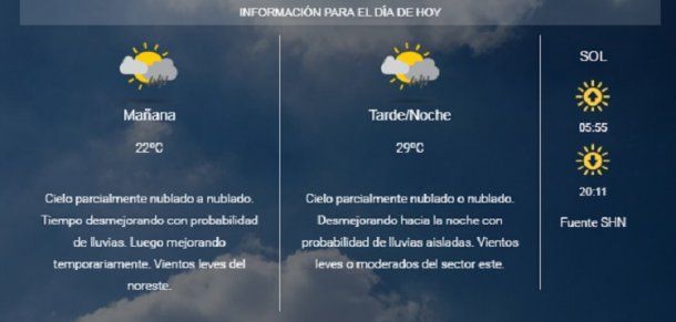 El Servicio Meteorológico Nacional pronostico un domingo con lluvias y unos 29° de máxima.