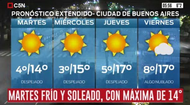 En tanto, el miércoles está pronosticado cielo despejado, vientos del sector noroeste rotando al oeste y una temperatura que estará entre los 3 grados de mínima y los 15 de máxima.