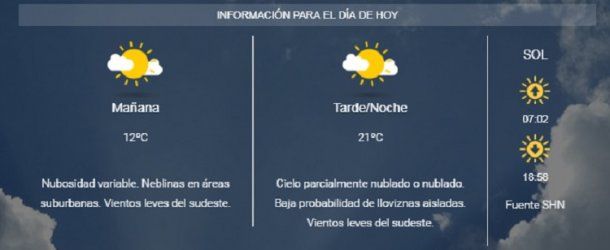 El SMN pronostica un martes fresco por la mañana y con probables lloviznas aisladas por la tarde noche. La temperatura rondaría entre los 12 y los 21 grados.