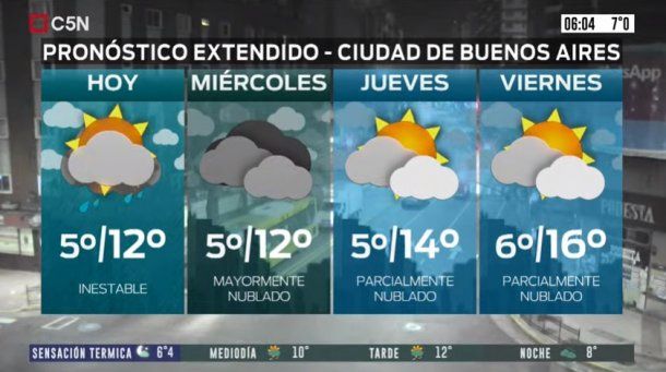 El miércoles está pronosticado cielo mayormente nublado, vientos del sector sur rotando al suroeste, con una temperatura mínima de 5 grados y una máxima de 13.