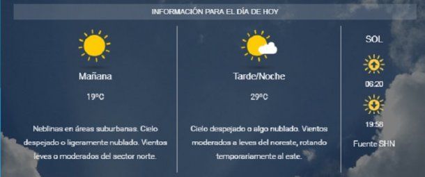 El Servicio Meteorológico Nacional pronostica un miércoles despejado con una temperatura que estaría entre los 19° y los 29°.